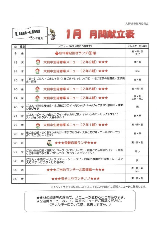 ランチ給食1月月間献立表 公開日 2025/12/15 更新日 2025/12/15 配膳室より 1月月間献立表を掲載していますの。確認してください。注文は、注文方法に従って行ってください。なお、1月は大利中生徒考案メニューや新年縁起担ぎランチなどイベントランチがいっぱいです。 1月月間献立表