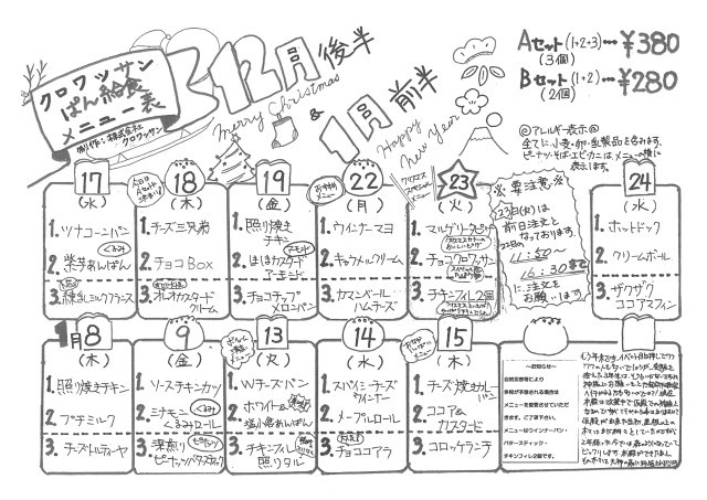 パン給食メニュー12月17日~1月15日
