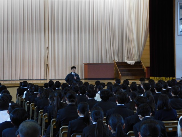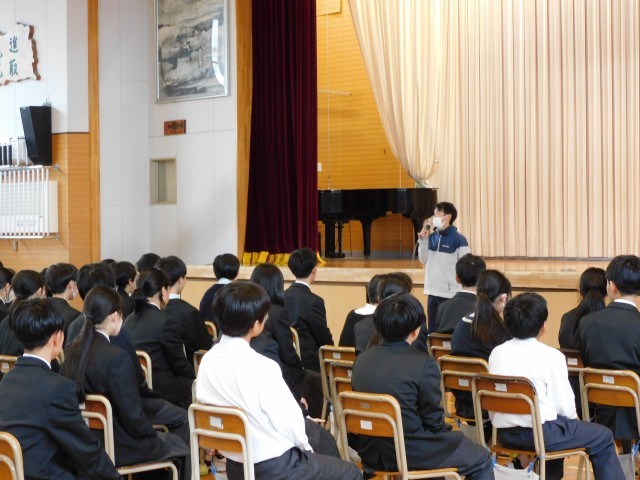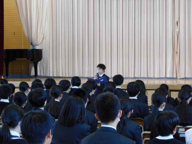 令和7年12月23日(火)6時間目に学年集会を体育館で行い、2学期の振り返りをしました。まず、生徒会執行部からの話。次に、学習面・生活面等について先生たちからそれぞれ話がありました。冬休みの過ごし方と3学期によりよい学校生活を送るための心構えを1年生全員で共有することができました。