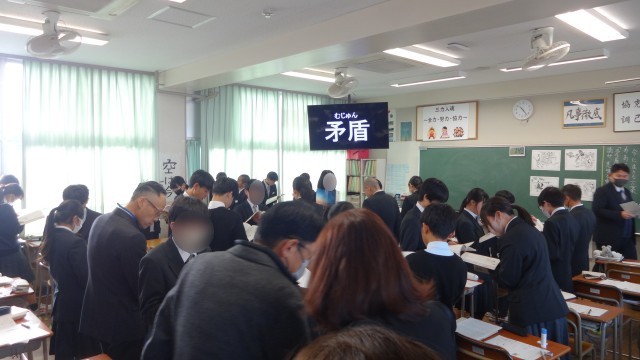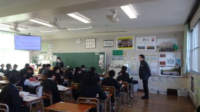 令和8年1月22日(木)2時間目に、大野城市教育委員会学校訪問があり、授業参観をしていただきました。1時間という短い時間ではありましたが、教育委員会の方からは、生徒の皆さんが落ち着いて授業を受けていること、班活動を協力して行っていること、あいさつや会釈を生徒の皆さんの方から明るくしてくれたこと等を、褒めていただきました。
