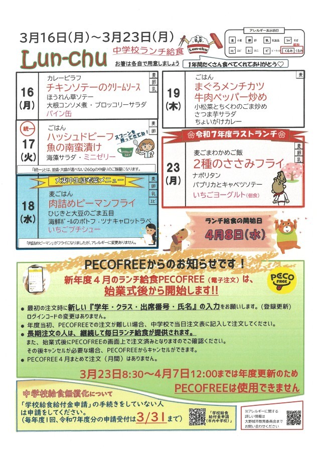 「Lun-chu」ランチ給食メニュー3月16日(月)から23日(月)までを載せています。令和8年度のランチ開始日は4月8日(水)です。3月16日~ランチメニュー
