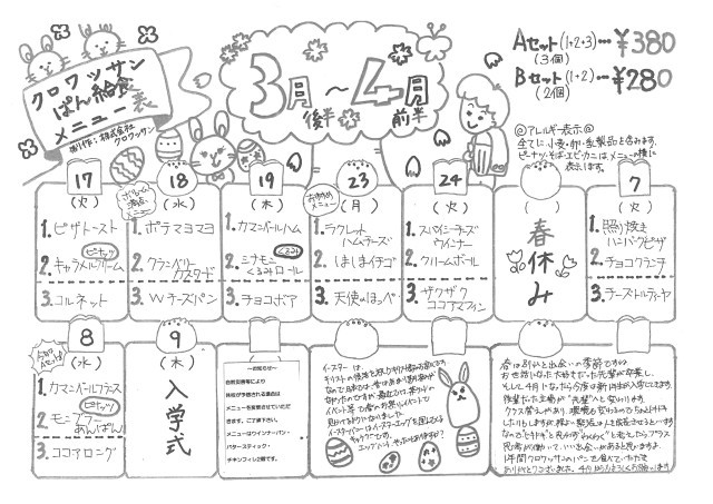 「Lun-chu」ランチ給食メニュー3月16日~3月23日&パン給食メニュー3月17日~4月8日