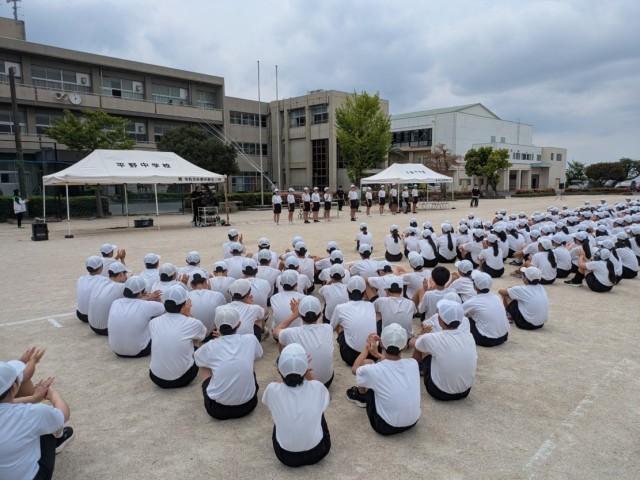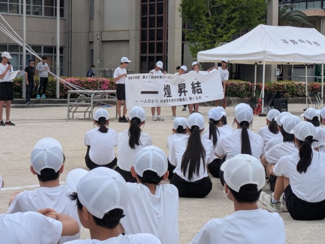 体育祭に各学年の目標が設けられていることに驚きました。「知る」とは1年生の目標で、先輩の姿・言動から学び、平野中学校の生徒としての自覚ある行動を身に付けるということ。「創る」とは2年生の目標で、平野中学校の生徒として、自ら考え行動することができるようになるということ。「導く」とは3年生の目標で、後輩を教え高めることで、1、2年生の平野中学校の生徒としての自覚と誇りを持たせるということ。それぞれの目標をぜひこの体育祭期間で達成してもらいたいと思います。