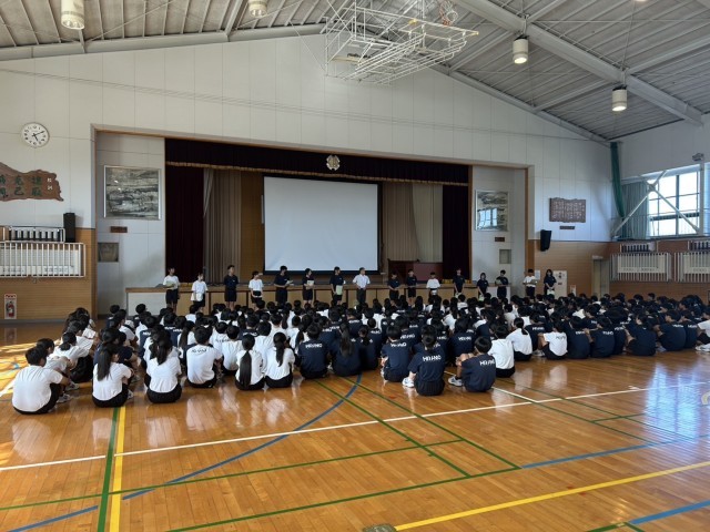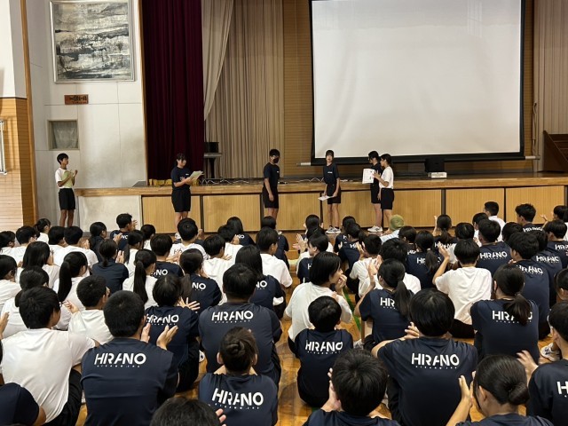 令和7年7月1日(火) 生徒会役員改選について、6時間目に1,2年生集会を行いました。第46期生徒会役員の3年生の先輩から、役員の仕事内容や熱い言葉をいただき、1,2年生も平野中の一員として一層頑張らないといけないと感じた集会になりました。暑い中ではありましたが冷風機を使ったり、水筒持参をしたりして熱中症対策を行いました。