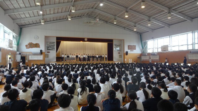 令和7年10月14日(火)5時間目 コンクール本番前最後のリハーサルでした。1、2年生も入場し、3年生の合唱を聴きました。各クラスが合唱曲を披露することを通していく中でどんどん引き込まれていきました。いよいよ明後日が本番です。さらに磨きをかけ、素晴らしい合唱になることを期待しています。