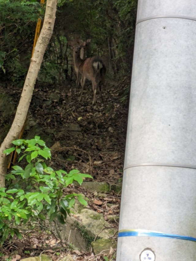 さて、私は今日、朝から出張で篠栗町にある福岡県教育センターという所に来て研修を受けています。福岡県教育センターは今年3月末日までの私の職場でした。このセンターは山の中にありまして、よくイノシシやシカ、アナグマなど野生の動物が出没していました。親イノシシの後ろに3頭ほどのうり坊が連なって坂道を歩く姿を見たことなどはとても可愛かったし、思い出に残っています。3枚目の写真は、昨年の6月頃、私が帰ろうとした時に門のそばにいたシカです。何頭いるかわかりますか?