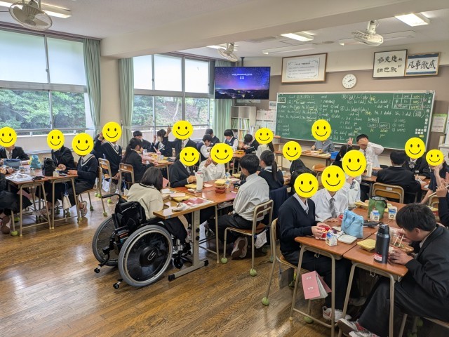 2年生のあるクラスにお邪魔し、何人かの生徒にランチ給食(Lun-chu)の感想を聞いてみると、「おいしいです!」「メニューに○○が出る時は苦手だけど、ほとんどはおいしいです!」「デザートが小さい(少ない)時があるけど、味はおいしいです。」(デザートが小さい時がある件は、日誌に書いておきますね(笑))など、肯定的な意見が多かったです。このクラスは、全体の7割強くらいがランチ給食(Lun-chu)でした。帰り際、写真(2枚目)を撮らせてもらいましたが、生徒も先生も素敵な笑顔でした。(可愛いマークに負けていませんでした!)