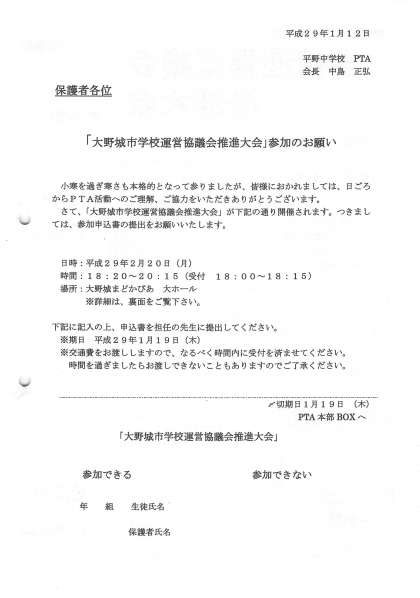 *冬休みから平野中校区でインフルエンザが発症しています。うがい・手洗い・換気の呼びかけを本校でも行いますので、ご家庭でもご指導お願いします。