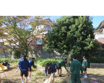 秋晴れの空のもと,25名の生徒が若草公園の清掃ボランティアに参加しました。地域の方と一緒に約1時間,草取りや落ち葉清掃を行いました。作業終了後には,数え切れない程のゴミ袋の数となりました。