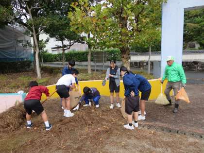 雨が心配されましたが、小雨の中無事に実施されました。『牛頸公民館』を清掃したのち、『畑ヶ坂南公園』や『宮野台西公園』『月の浦近隣公園そばの道路』など5グループに分かれて、清掃活動に取り組みました。どのグループにおいても、生徒たちは主体的に取り組むことができていました。