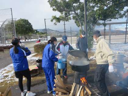 12月18日(日)に南ヶ丘2区で「もちつき大会」が開催されました。雪が積もる中、早朝9時よりボランティアとして16名の生徒が参加しました。