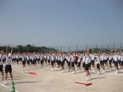 5月17日(木)は天気が心配されたものの太陽が照りつける青空のもと予定通りに体育祭練習が行われました。前半は、本番通りに「入場行進」「ラジオ体操」を行い、後半は「ブロック練習」が行われました。体育祭まで『あと3日』となり、各ブロックとも演技ができあがってきました。どのブロックも本番での演技が楽しみです。