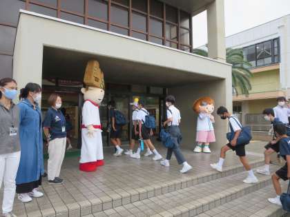 平野中学校には,「大野ジョーくん」と「まどかちゃん」が駆けつけてくました。生徒たちは,元気よく登校することができていました。