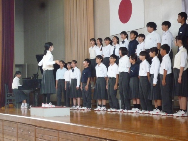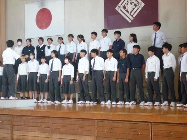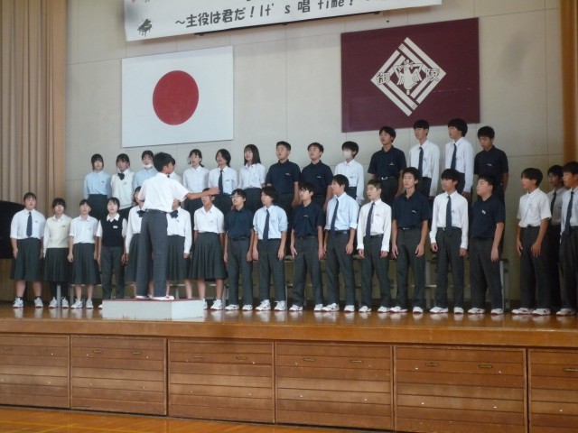 1学年では、2組・3組・1組の順番で合唱を行いました。どのクラスも完成にはまだもう少しといったところですが、とにかくみんなで一生懸命歌っている姿が印象的でした。他のクラスの合唱を聴くことも新鮮で、しっかりとした態度で聴き、少なからず危機感も感じたようでした。