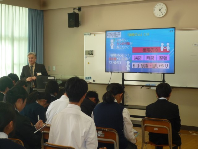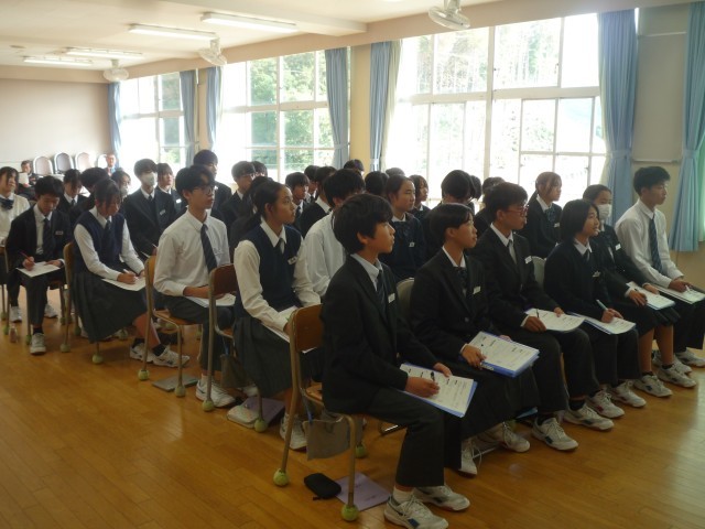 生徒会新旧交代式から1日経ち、第44期生徒会が動き始めました。本日はリーダー研修が行われ、第44期生徒会役員と各部活動の部長・副部長が参加しました。教頭先生に講義をしていただき、「リーダーとは?」と「御陵の心」の2つについて学びました。「リーダーとは?」では、リーダーとしてあるべき姿やすべきことについて考えを深めました。「御陵の心」では、生徒会役員が考えたものを基に、「御陵の心」を学校全体に浸透させるための「挨拶」「時間」「整頓」という3つの行動を設定しました。具体的な目標が決まったことで、何をしてどのような姿を目指すのかが明確になったと思います。今回の講義の中で生徒たちは、今の自分と向き合い、リーダーとして何を目指しどんな行動をとっていくべきかを真剣に考えることができたと思います。これから、生徒会役員は委員の仕事や学校行事で、部長・副部長は日々の部活動で周りを引っ張っていかなければなりません。今回学んだことを念頭に、これからの学校生活を過ごしていってほしいです。また、これを自分の中で留めるだけでなく周りに積極的に発信し、「御陵の心」を学校全体に広げ、よりよい御陵中学校を創り上げてほしいです。