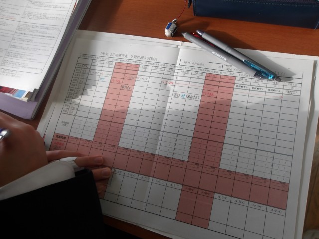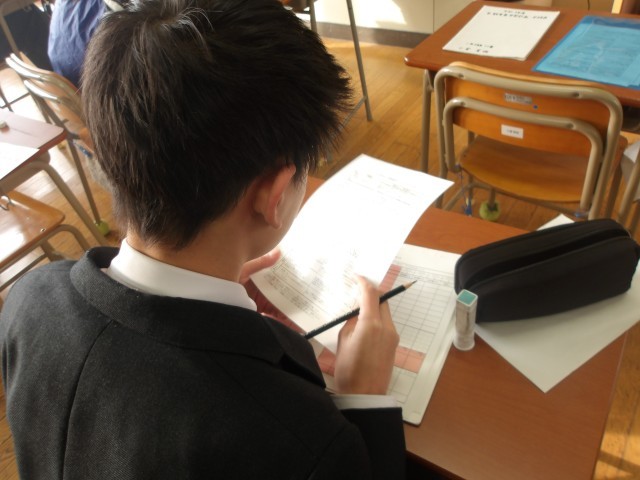 1年生が2月にある定期考査に向け、学習計画を立てています。前回のテストの良かった点や反省点を振り返り、目標点数を記入していました。担任の先生からは、